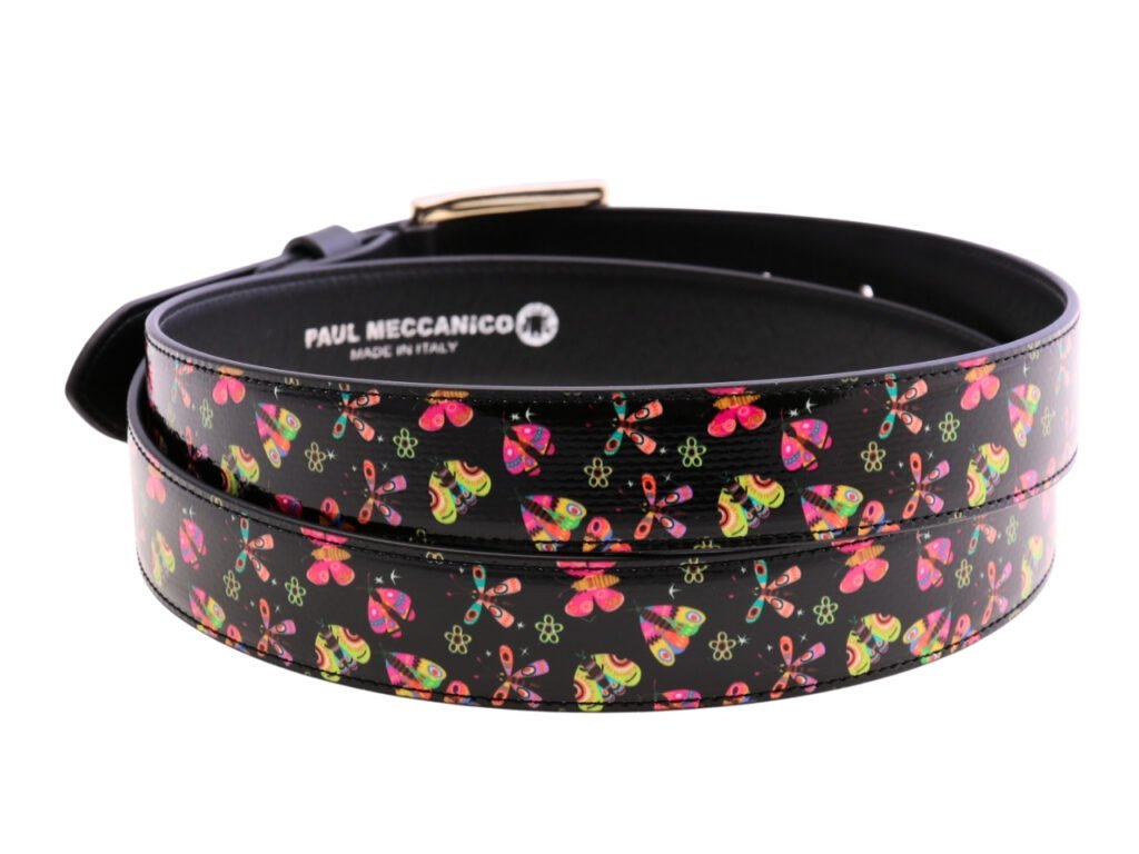 BLACK WOMEN’S BELT “FLOWERS AND BUTTERFLIERS” MADE OF LORRY TARPAULIN